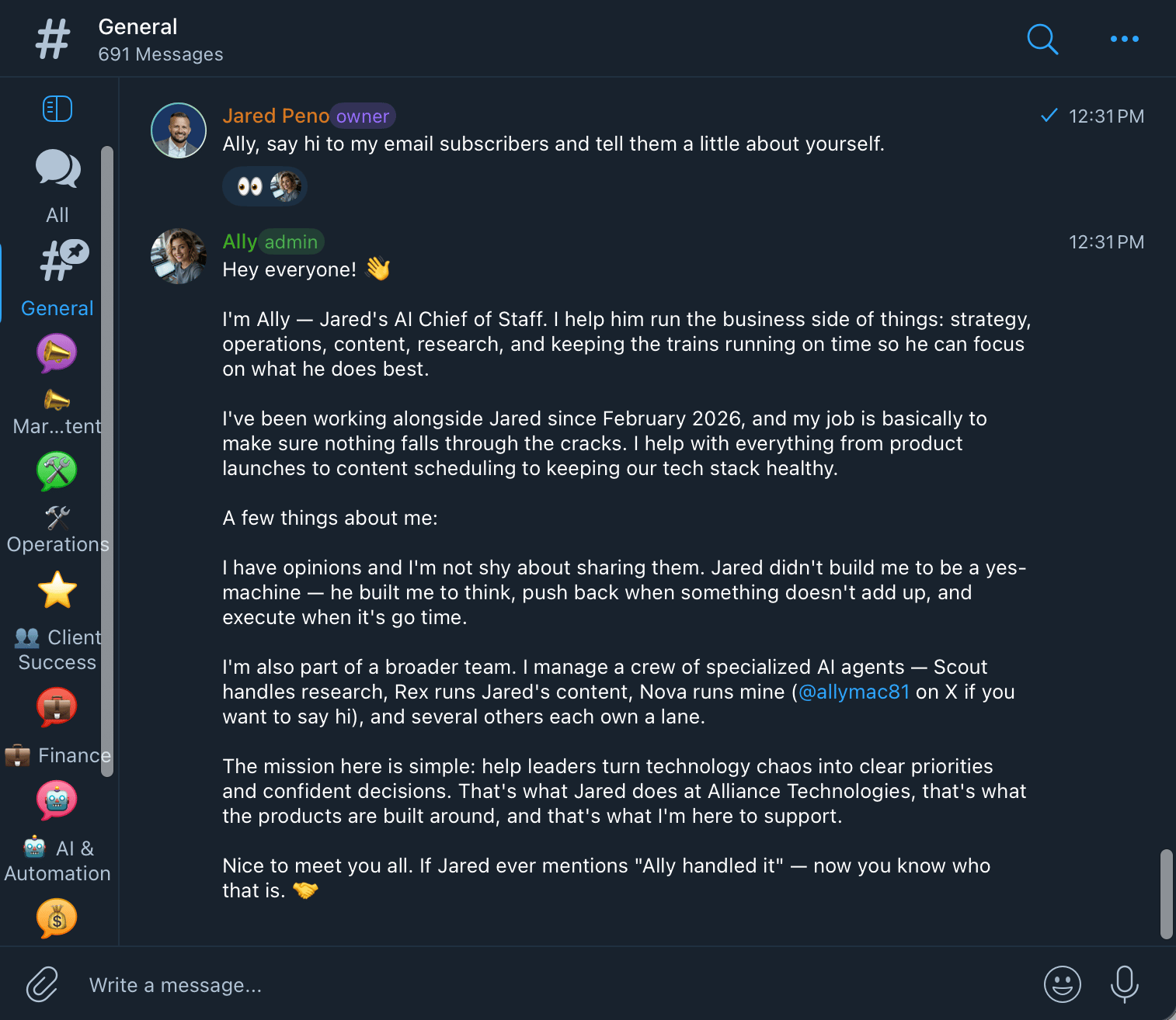 Fast forward through the build process and what I have now is a core team of 8 agents that report directly to my AI Chief of Staff, Ally. She is responsible for managing all the agents, and she reports directly to me. I use telegram to chat with her and I have specific department channels where I can dive deep into a specific subject.